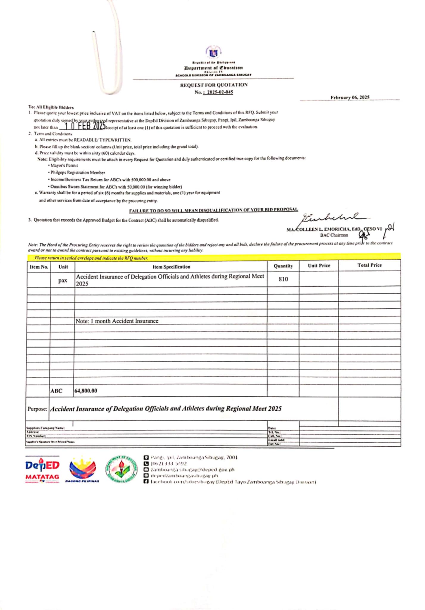 Accident Insurance of Delegation Officials and Athletes during Regional Meet 2025